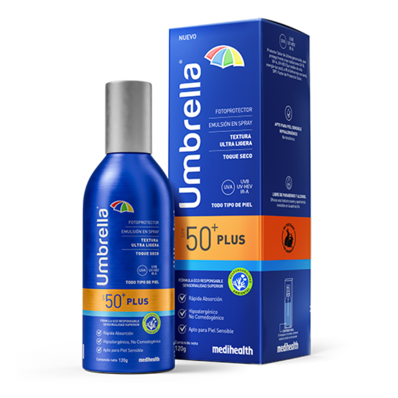Umbrella Plus 50+ es una formulación que combina filtros solares con una pantalla orgánica, por lo cual ofrece una triple acción: Absorbe, refleja y dispersa la radiación ultravioleta A y B. Umbrella Plus brinda a la piel una alta protección contra la radiación ultravioleta de origen natural (producida por el sol) y artificial.